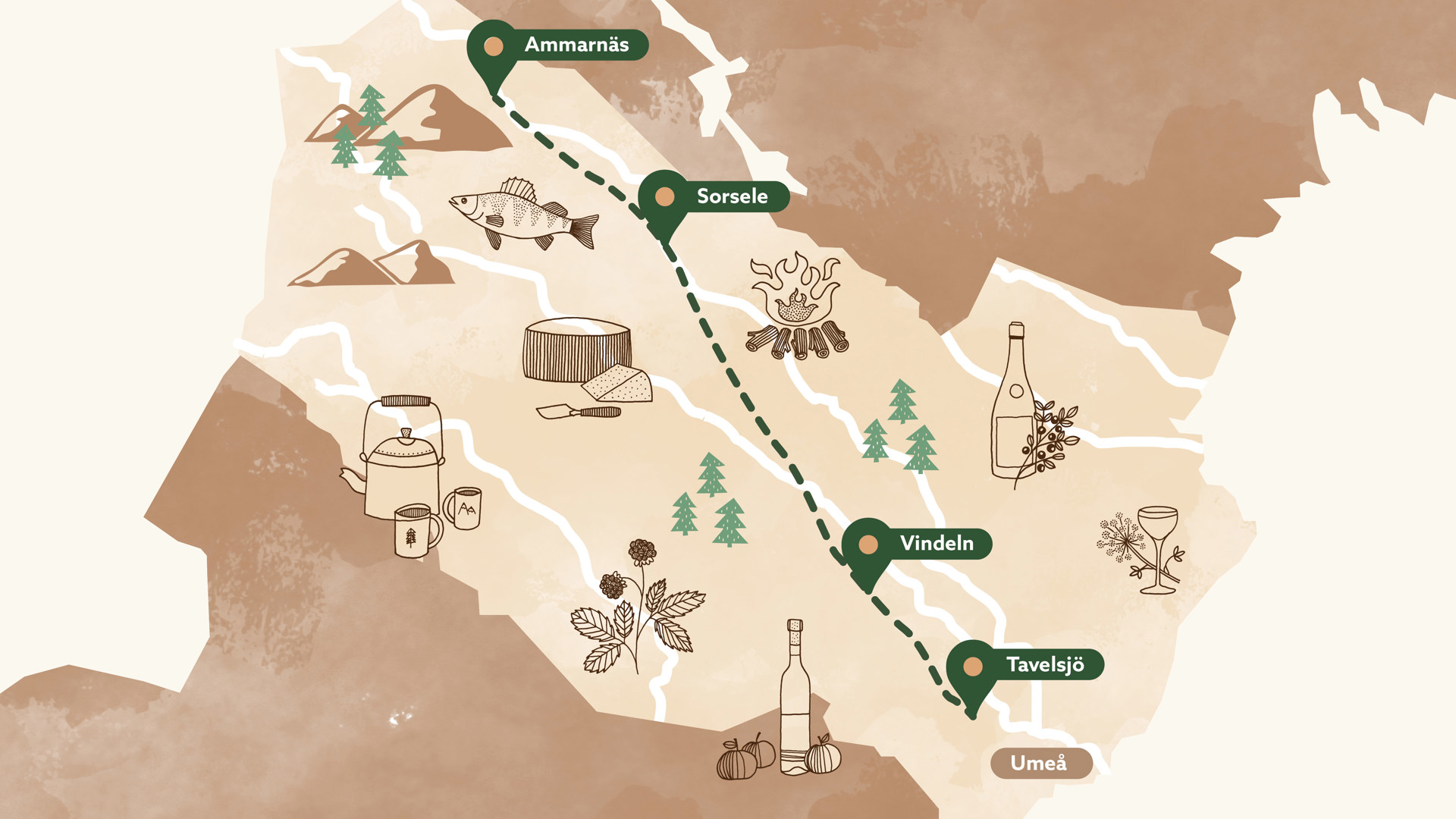 A road trip along rushing rivers, through vast forests, and into the untamed flavors of Västerbotten. The route brings you close to passionate food creators and the wild nature that provides their unique ingredients.